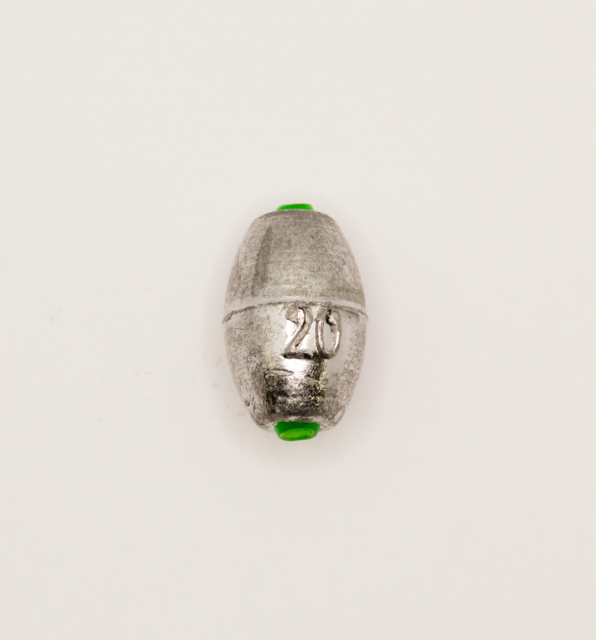 Oliivinmuotoinen liukupaino valmistettu lyijystä. Sisällä muovinen putki estämässä siiman kulumista