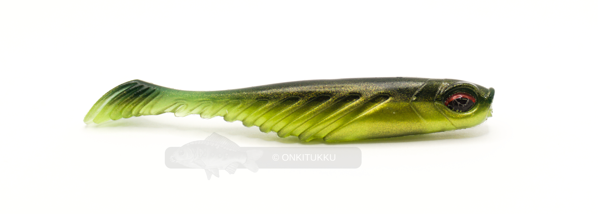 Lapapyrstöinen kalajigi punaisilla 3D-silmillä. Jigissä on uurteet jotka saavat aikaan houkuttelevan uinnin ja värinän. Väritykseltään selkä on musta ja vatsapuoli on oliivinvihreä. Venyvyys on noin 40%. Ahvenen viimeinen ateria voi olla tässä. Pussissa 10kpl