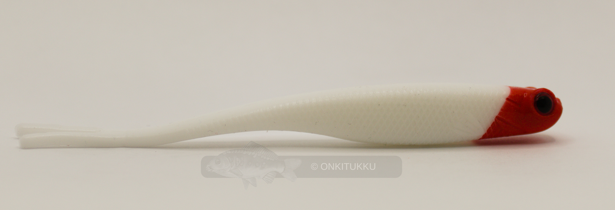 Kaksivärinen haarukkapyrstöinen kalajigi 3D-silmillä. Punainen pää, muuten valkoinen. Notkea ja kestävä. Venyvyys noin 40%. Erittäin vahva potku pyrstössä. Pyrstö kestää myös jonkin verran kalan hampaita menemättä rikki. Erittäin hyväksi todettu malli kuhalle ja ahvenelle. Pussissa 5kpl