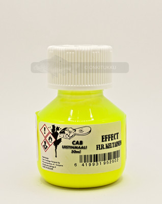 CAB Effect-maalisarjaan kuuluu erikoispigmentoituja värejä. Sarja koostuu fluorisoivista väreistä ja erilaisista metallipigmentoiduista väreistä. Fosfori on itsevalaiseva maali, joka luovuttaa varaamaansa valoa pimeässä. Effect-tuotteita ei suositella viimeiseksi kerrokseksi uistimiin. Korkean kiillon saavuttamiseksi suosittelemme pintalakkaukseen CAB-uistinlakkaa. CAB-maalit ovat liuotinohenteisia.
