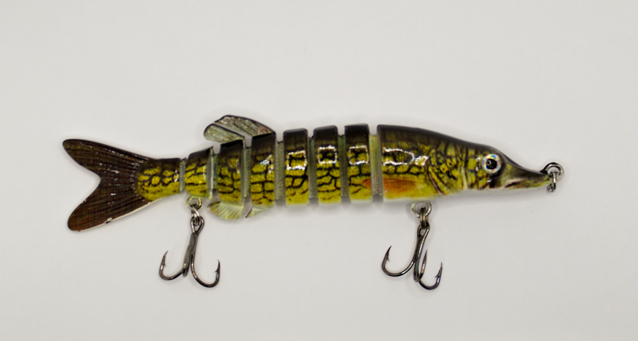 Yhdeksän osainen viehe minkä ansiosta uintiliike on sulava ja luonnollinen. Vieheessä kaksi kolmihaarakoukkua.