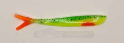 Kolmivärinen haarapyrstöinen kalajigi. Vihreä selkä mustilla hileillä, alapuolelta keltainen oranssilla läikällä ja oranssilla pyrstöllä. Venyvyys noin 40%. Erittäin hyväksi todettu malli kuhalle ja ahvenelle. Pussissa 4kpl