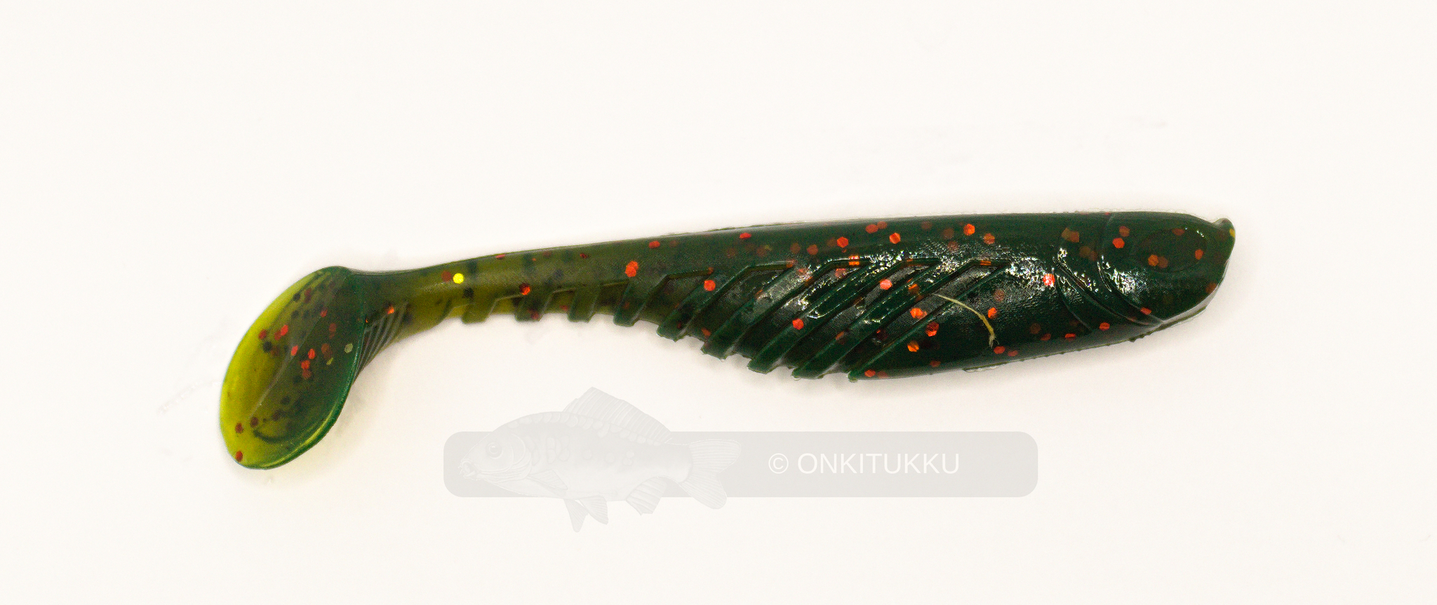 Lapapyrstöinen kalajigi. Jigissä on uurteet jotka saavat aikaan houkuttelevan uinnin ja värinän. Väritykseltään vihreä punaisilla hileillä, ja moottori öljyn kimalluksella. Venyvyys on noin 40%. Ahvenen viimeinen ateria voi olla tässä. Pussissa 5kpl