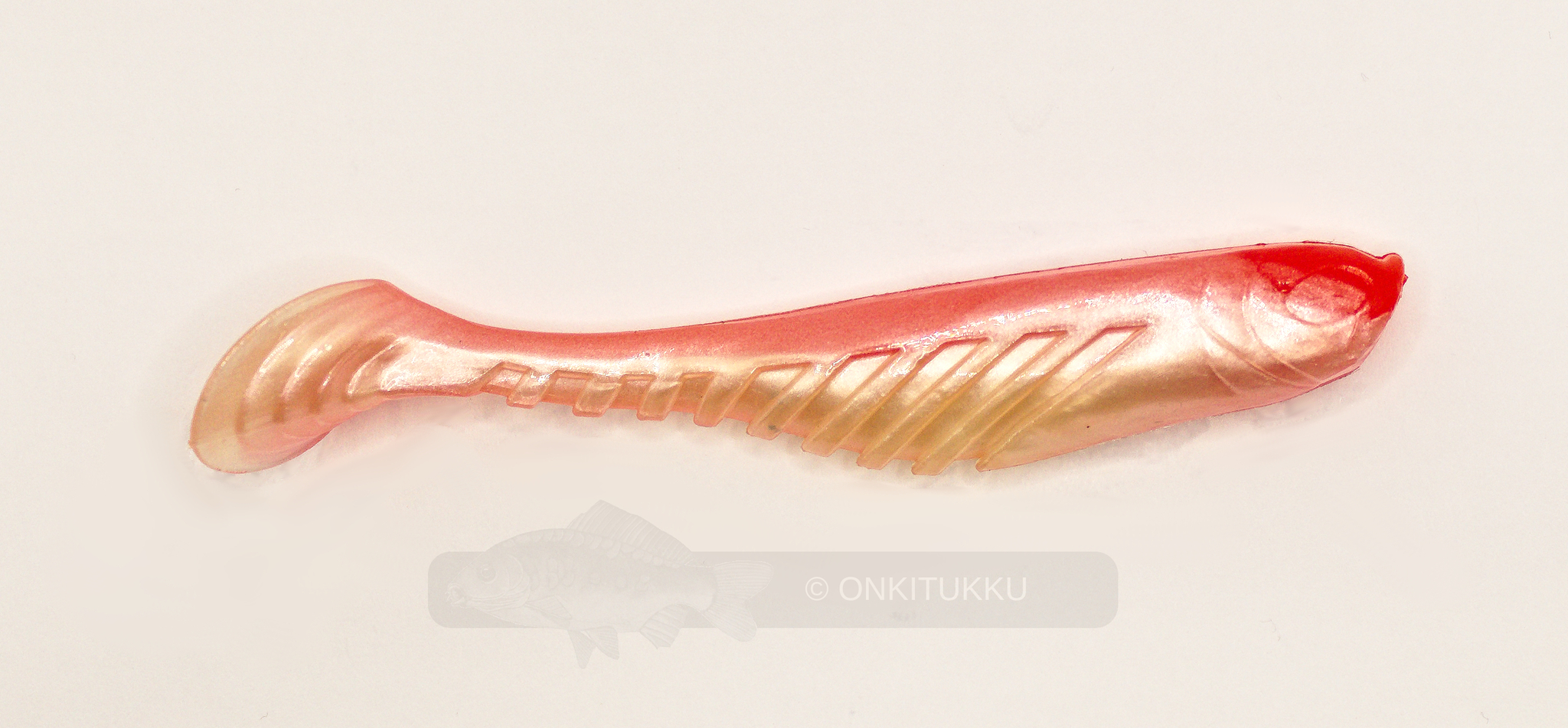 Lapapyrstöinen kalajigi. Jigissä on uurteet jotka saavat aikaan houkuttelevan uinnin ja värinän. Väritykseltään selkä on vaaleanpunainen, vatsa on kermanvalkoinen ja päässä on punainen läikkä. Venyvyys on noin 40%. Ahvenen viimeinen ateria voi olla tässä. Pussissa 5kpl