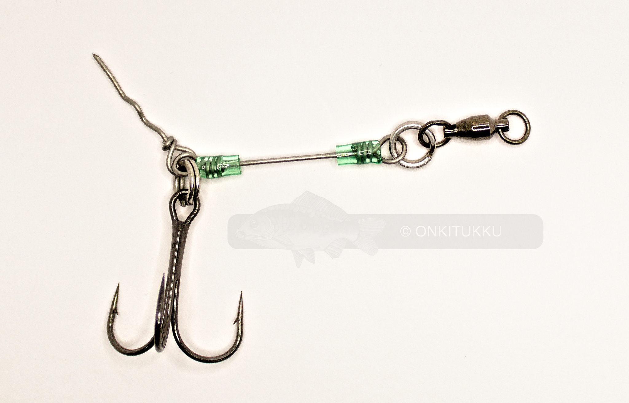 Valmisrigi jigeihin ja shadeihin leikarilla ja kemiallisesti teroitetulla kolmihaarakoukulla jonka vieherenkaassa on kiinnityspiikki. Langanpituus on 4,5cm. Sopii hyvin noin 20cm shadeille.Koukun koko: 1/0