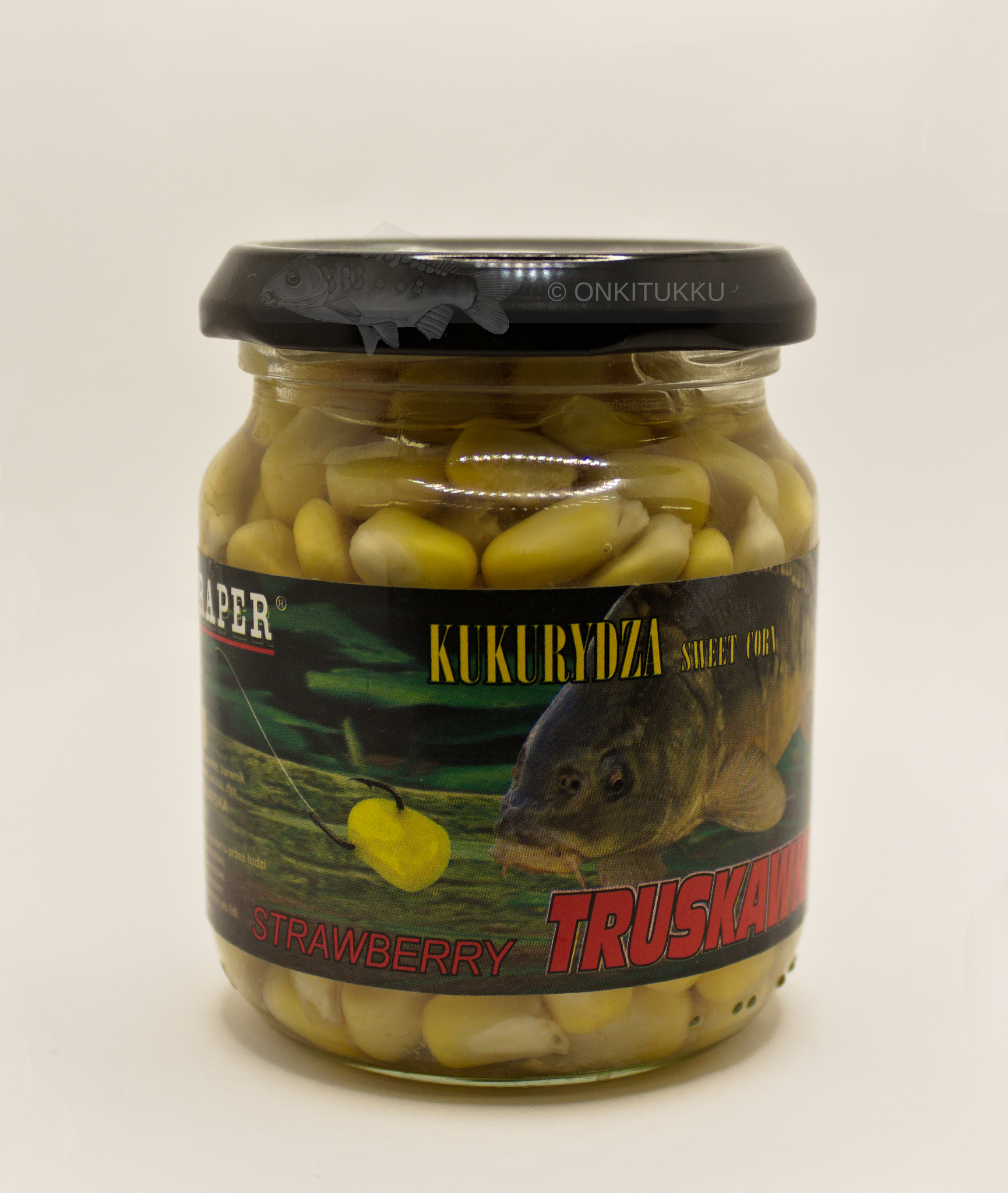 Keltainen maissinjyvä mansikan tuoksulla. Uudelleen suljettavassa lasipurkissa on 125g.