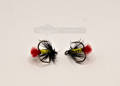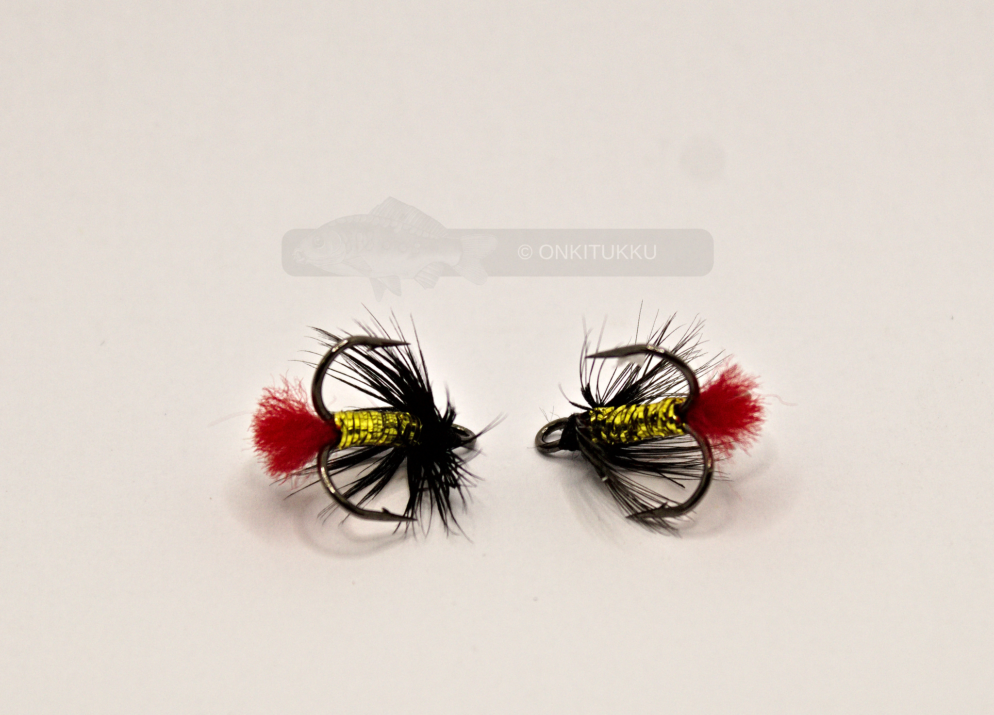 Pakkauksessa 5kpl perhoja. Sidonnassa käytetty Kujira:n kemiallisesti teroitettuja kolmihaarahiiliteräskoukkuja.