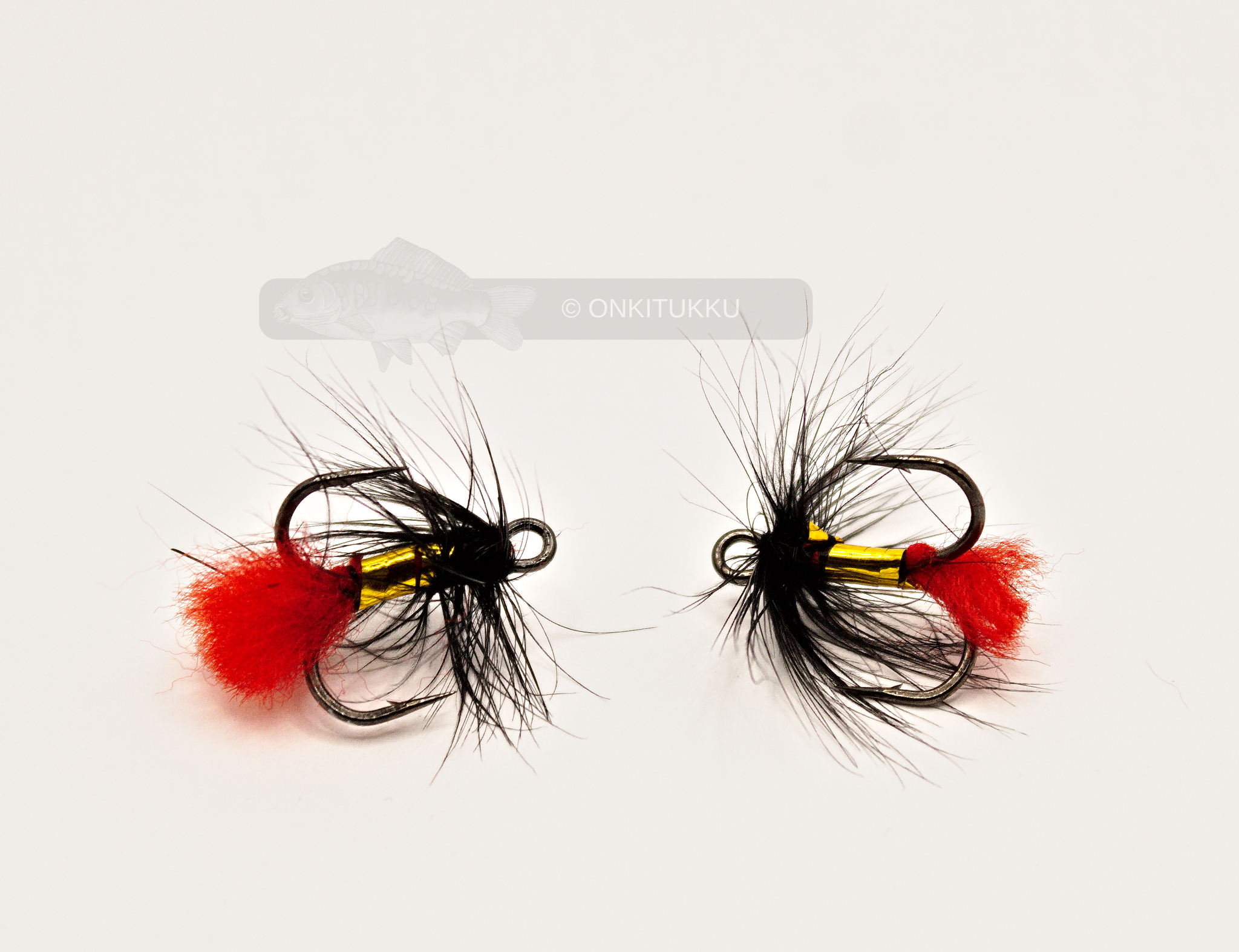 Pakkauksessa 5kpl perhoja. Sidonnassa käytetty Kujira:n kemiallisesti teroitettuja kolmihaarahiiliteräskoukkuja.