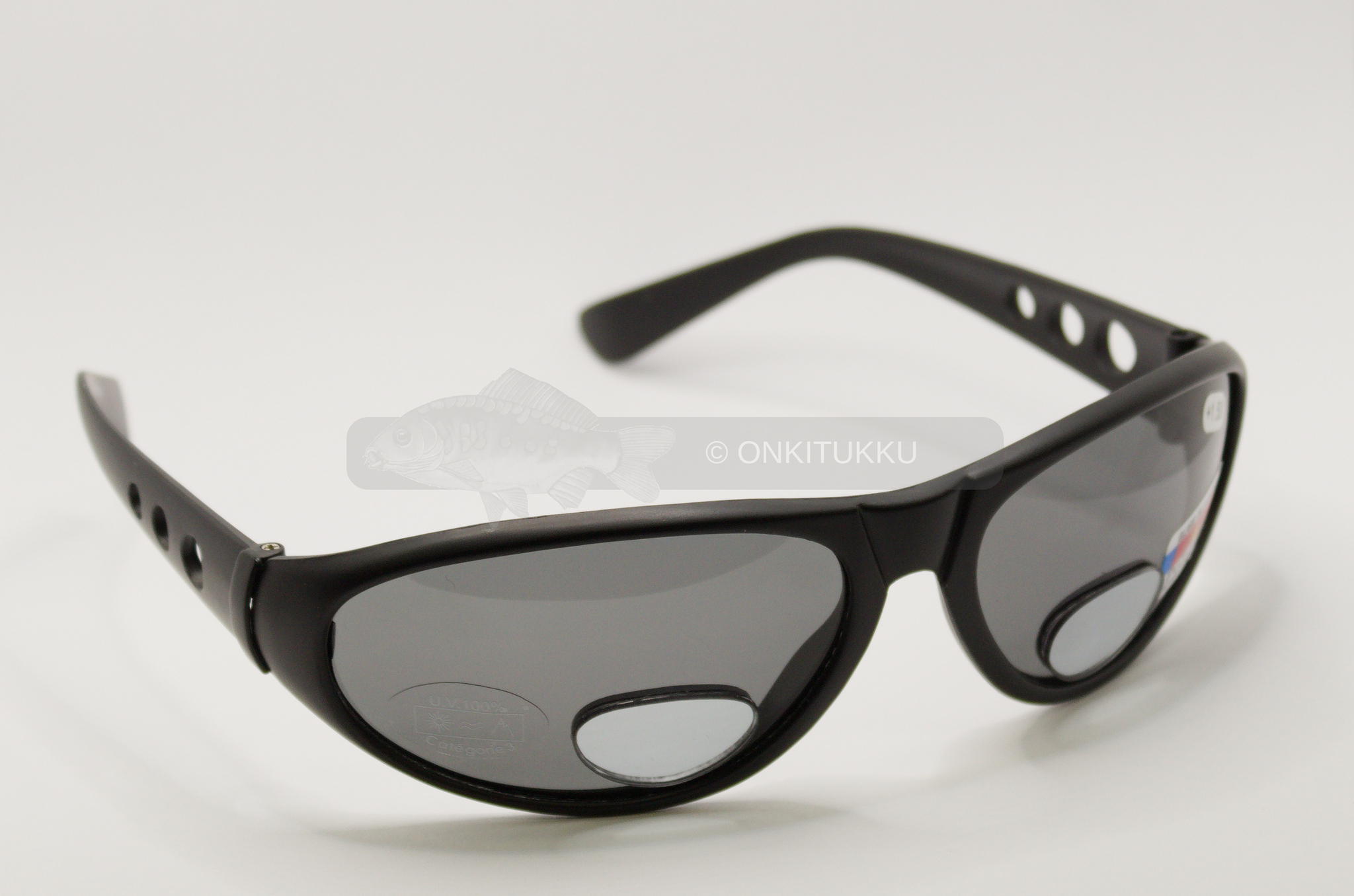 UV 400 suojatut ja polarisoidut aurinkolasit joissa on savunväriset 0,8mm linssit. Suurentava pienempi lukulasilinssi vahvuudeltaan +2,0